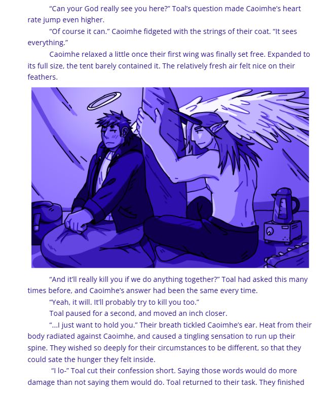 Their love is hindered by Caoimhe’s connection to the divine, their God will kill them for showing affection to anyone but itself.